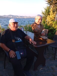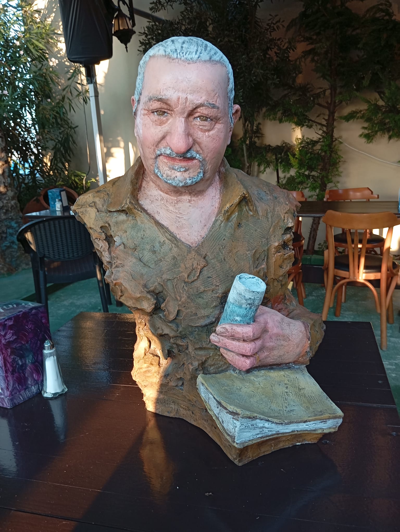 Ahmet Tanrıverdi’nin (isminin açıklanmasını istemeyen) seçkin arkadaşlarından biri ona sürpriz yaparak artık adı Adaların heykeltıraşı olarak anılacak Çağdaş Erçelik’e büst siparişi veriyor. Geçtiğimiz hafta sonu (3 Ağustos 2025) sanatçı eseriyle Prinkipo’dan içeri girince Ahmet’le birlikte bütün masalar ayağa kalktı. Ambalaj özenle açıldı. İçinden kadehi ve kitabıyla Büyükada’nın yaşayan efsanesi çıktı: